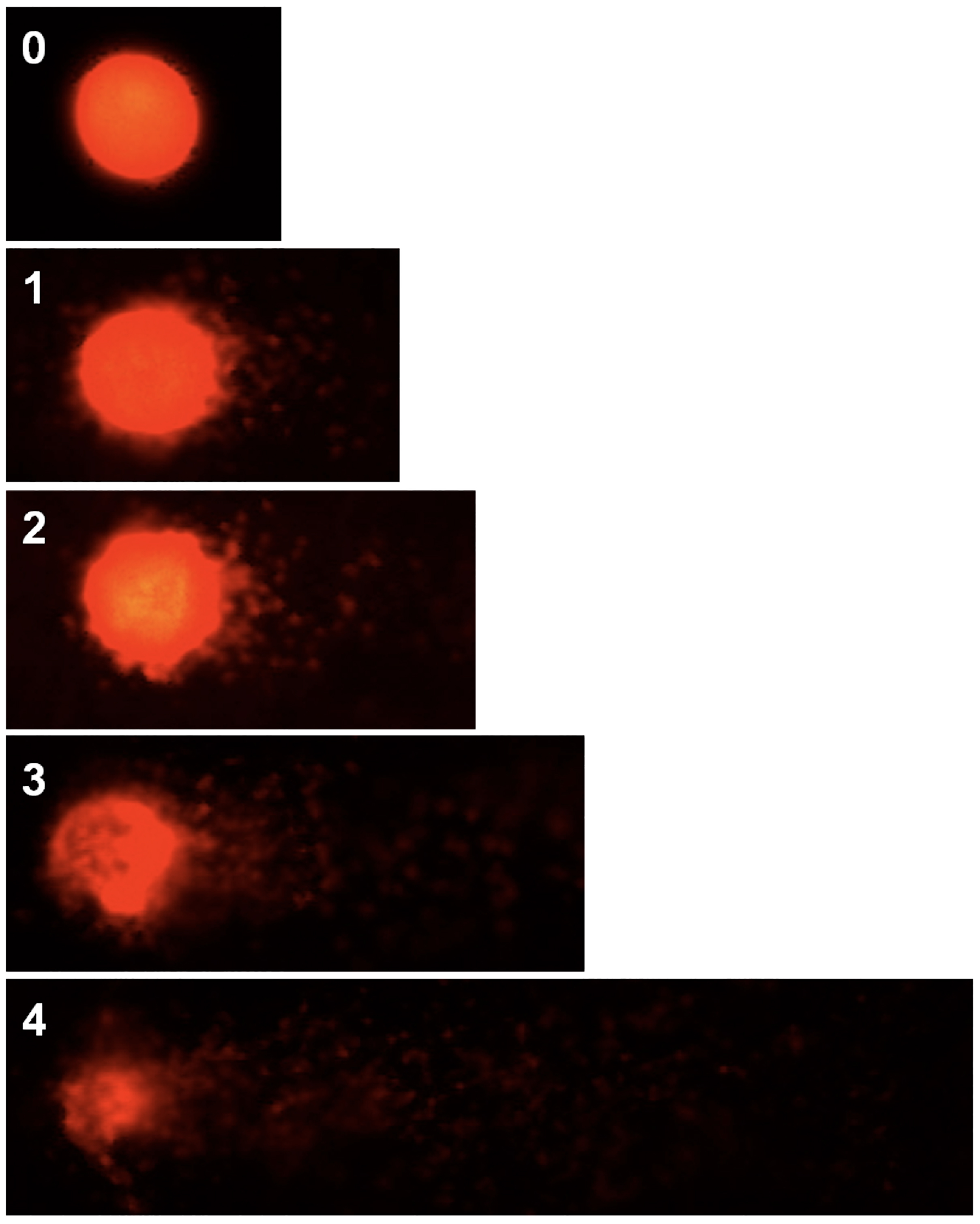 Human peripheral blood lymphocytes: 0: nuclei without DNA damage (without comet) and 1, 2, 3, 4: nuclei with ascending DNA damage. 400 X.