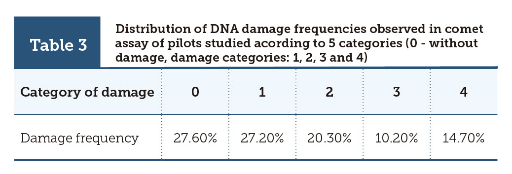 | Table 3 | Distribution of DNA damage frequencies observed in comet assay of pilots studied acording to 5 categories (0 - without damage, damage categories: 1, 2, 3 and 4) |