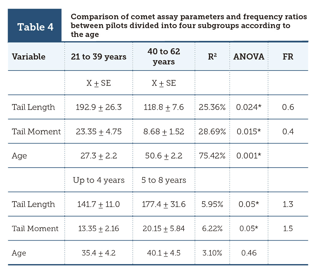| Table 4 | Comparison of comet assay parameters and frequency ratios between pilots divided into four subgroups according to the age |