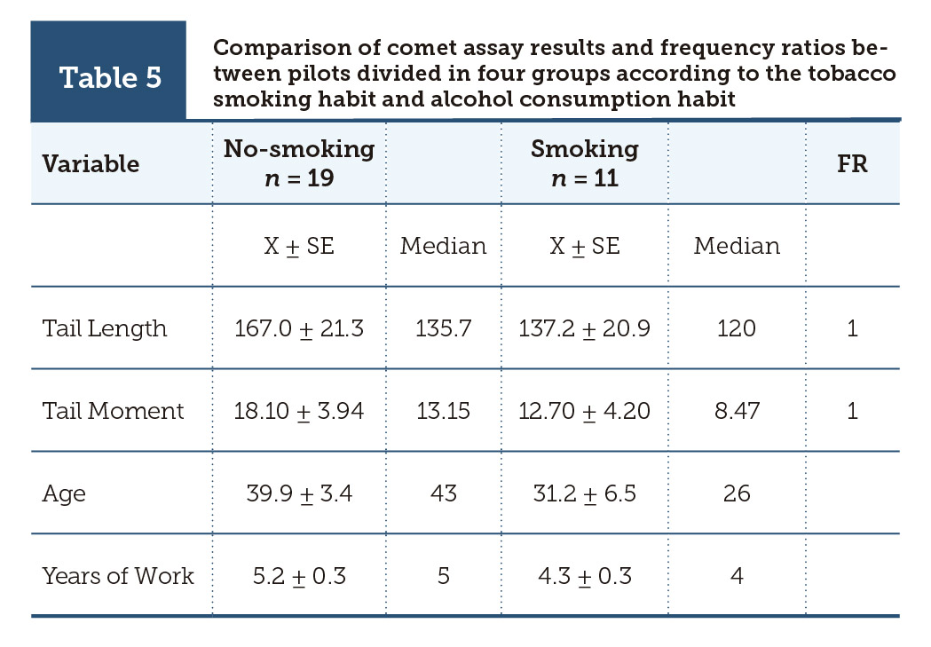 | Table 5 | Comparison of comet assay results and frequency ratios between pilots divided in four groups according to the tobacco smoking habit and alcohol consumption habit |