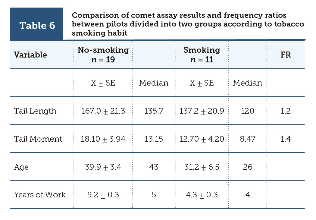 | Table 6 | Comparison of comet assay results and frequency ratios between pilots divided into two groups according to tobacco smoking habit |