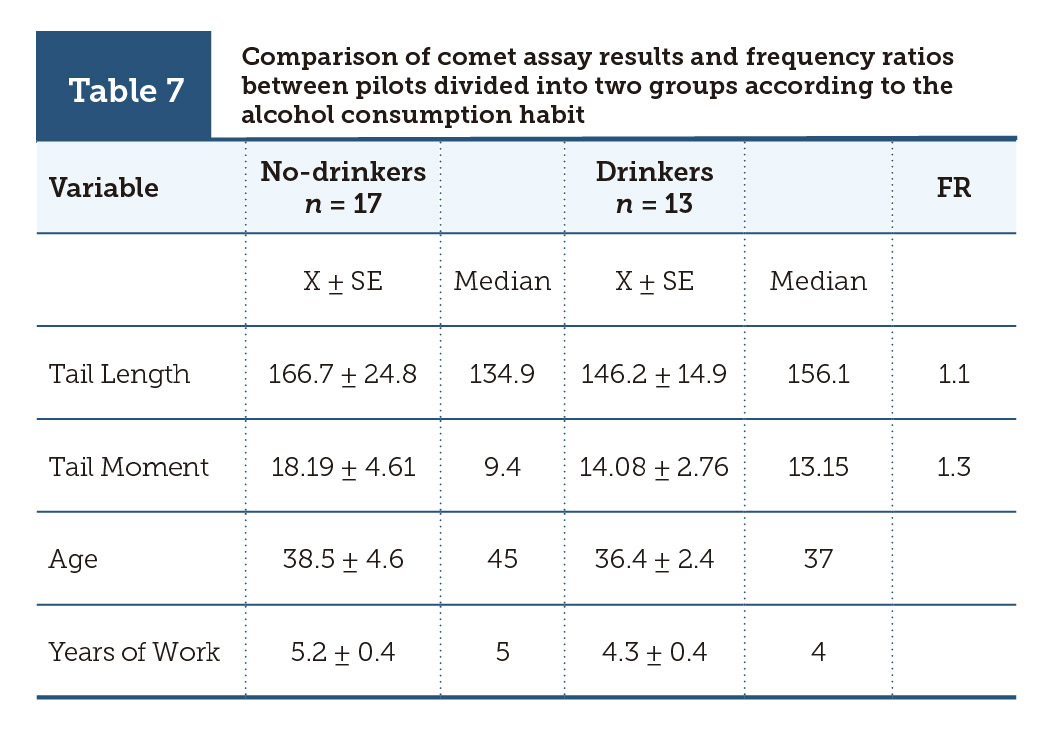| Table 7 | Comparison of comet assay results and frequency ratios between pilots divided into two groups according to the alcohol consumption habit |