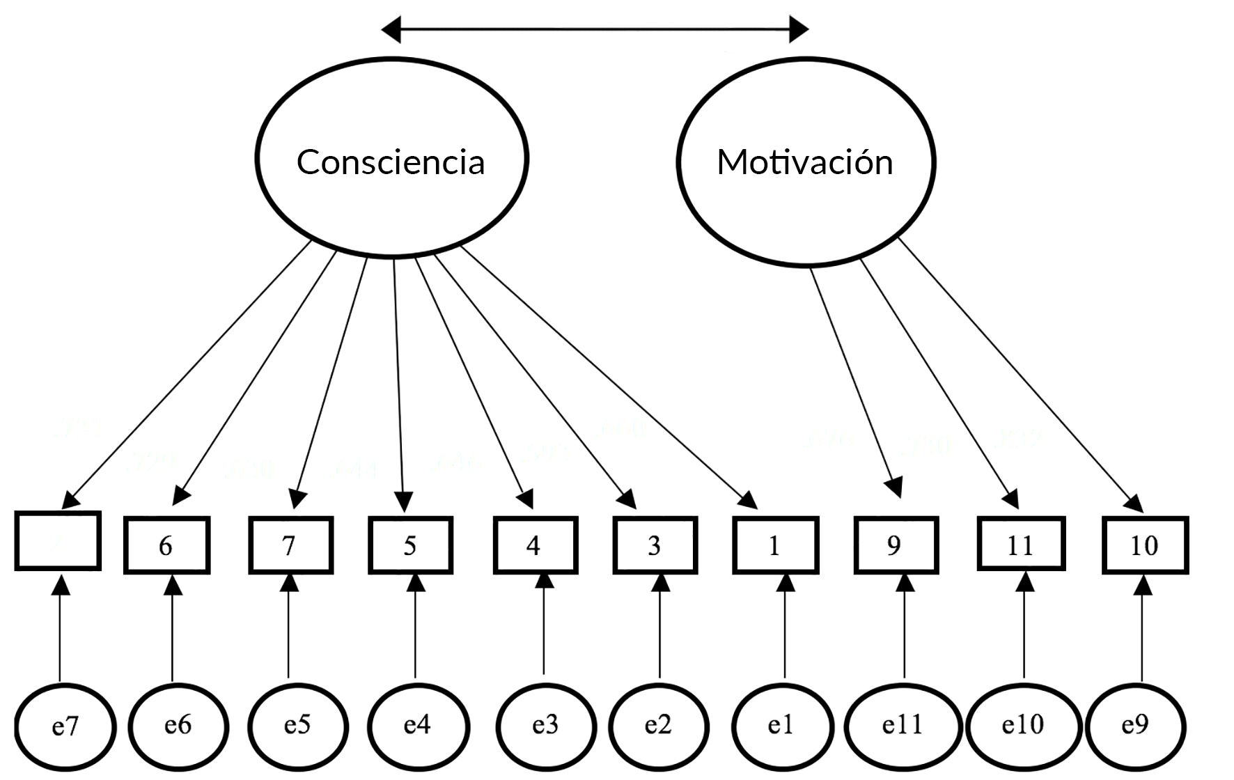 Se utilizó la medida de adecuación muestral de Kaiser-Meyer-Olkin (KMO) = 0.831, prueba de esfericidad de Bartlett (X2 = 635.475; gl = 55, p < 0.000). El análisis factorial exploratorio se realizó con rotación varimax sobre el total de ítems de la escala. El resultado arrojó dos factores, en el primero se agrupan siete ítems correspondientes a las escalas de conciencia y responsabilidad a excepción del ítem 8, el cual se agrupa en el segundo factor con los ítems de la subescala de Motivación del instrumento original, no obstante este ítem no presenta adecuada puntuación de componente para mantenerse en ninguno de los dos factores (tabla 2).
