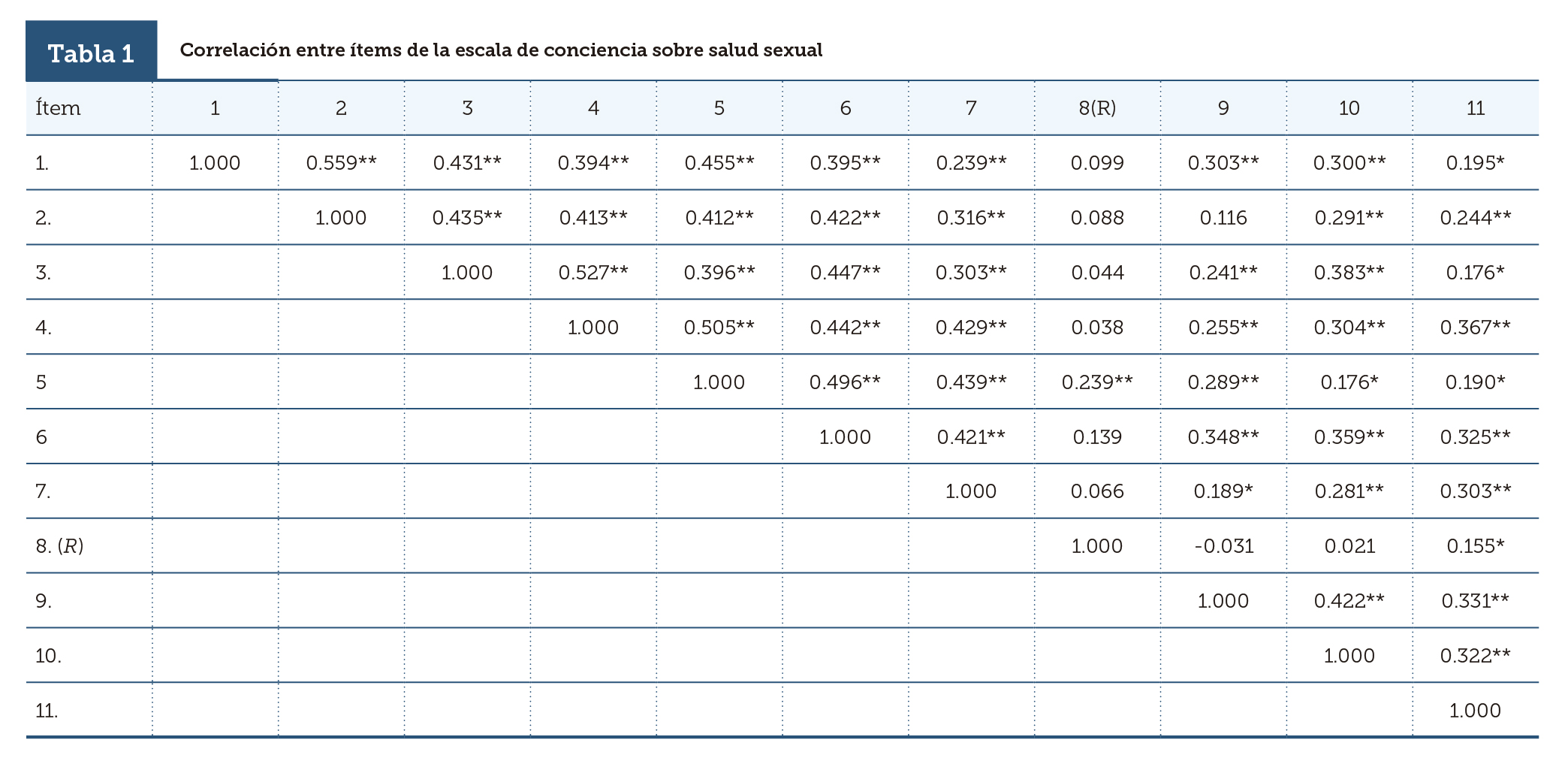 | Tabla 1 | Correlación entre ítems de la escala de conciencia sobre salud sexual |