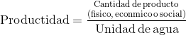 La definición de productividad, es decir un cociente, donde el numerador se encuentra la cantidad de producto físico (toneladas por hectárea), económico (ganancia por hectárea) o social (empleos generados por hectómetro); mientras que en el denominador se registra la cantidad de agua medida en litros, metros cúbicos, hectómetros o millones de metros cúbicos (L, m3, hm3, o Mm3), obteniéndose el modelo matemático para determinar la productividad del agua: