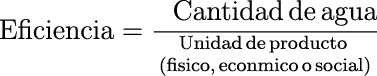 Viets (1966) probablemente fue quien citó por primera vez el término eficiencia del agua para explicar la relación entre la producción agrícola y la aplicación de agua. Este término ha sido muy utilizado para describir el rendimiento generado (biomasa o económico) por unidad de agua aplicada. Desde la perspectiva agronómica existen diferentes definiciones, dentro de las cuales la eficiencia del riego significa la proporción o cantidad de agua aplicada o asignada a un cultivo para su producción dividida entre la proporción de agua que se aplicó. No obstante, para el desarrollo de este trabajo se empleó la definición eficiencia del agua, propuesta por Mekonnen & Hoekstra (2011), como un cociente donde el numerador se encuentra la cantidad de agua empleada para la producción de determinado cultivo, y en el denominador se encuentra la cantidad de producto generado (físico, económico, social). La ecuación general para un número índice de eficiencia del uso del agua estará dada por: