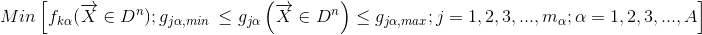 Donde el vector `\overrightarrow{X}` es conformado por las variables genéricas `x_{1}, x_{2}, ..., x_{n}`, las cuales pertenecen al espacio de diseño Dn. Dichas variables tienen límites inferiores y superiores que se relacionan con limitaciones físicas, económicas o de diseño; un diseño se considera factible si cumple la condición en la cual todas las variables se encuentran dentro de los límites del diseño.