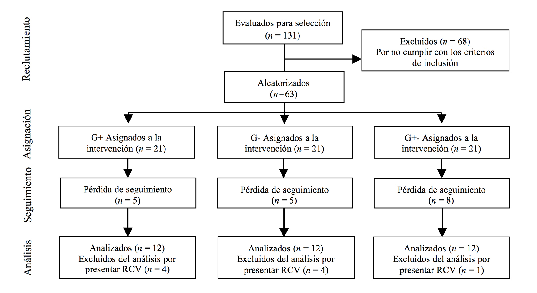 Ingresaron al estudio 131 participantes de las cuales se excluyeron 68 y se aleatorizaron 63 por cumplir con los criterios de inclusión. Las pérdidas de seguimiento ocurrieron por que las participantes no se presentaron a la cita; por otro lado las participantes que realizaron la prueba de esfuerzo y se excluyeron para el análisis, fue por presentar un grado de depresión leve, de acuerdo a los puntos de corte del Instrumento BDI-II, lo cual fue considerado como un criterio de exclusión. El flujo de las participantes se muestra en la figura 1.