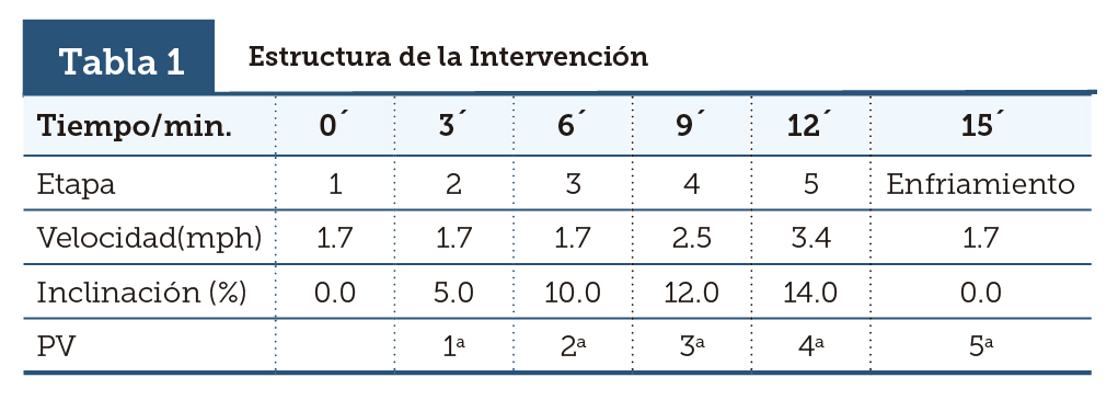 4) Prueba de esfuerzo y manipulación de la auto-eficacia. Se realizó una prueba de esfuerzo controlada bajo el mismo protocolo de rendimiento cardiovascular para los tres grupos de forma individualizada y paralela. Cada prueba de esfuerzo se realizó a puerta cerrada del laboratorio en diferentes horarios, alternando en cada una de ellas a los sujetos de cada grupo para evitar comunicación y amenazas al método. En la tabla 1 se muestra la estructura de la intervención la cual constó de tres fases, la primera corresponde al calentamiento donde se realizaron ejercicios de forma pasiva en dirección cefalocaudal; en la segunda fase se llevó a cabo la prueba de esfuerzo con base al Protocolo de Bruce con cinco de las siete etapas (Cid-Juárez et al., 2015).