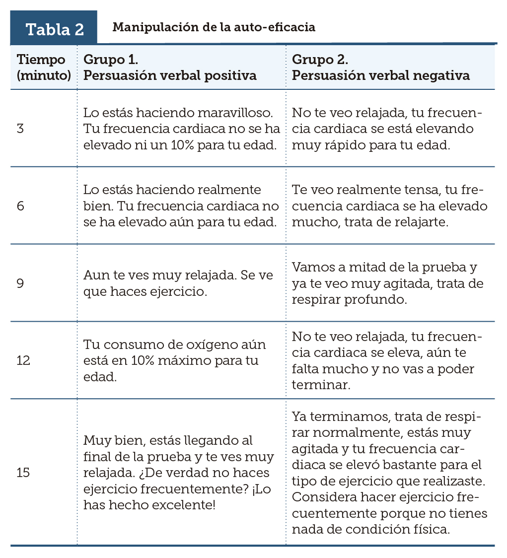 Cada tres minutos durante la prueba de esfuerzo, fue manipulada la auto-eficacia a través de la persuasión verbal (PV) positiva para el G1, como PV negativa para el G2, el G3 completó la prueba sin PV (tabla 2).
