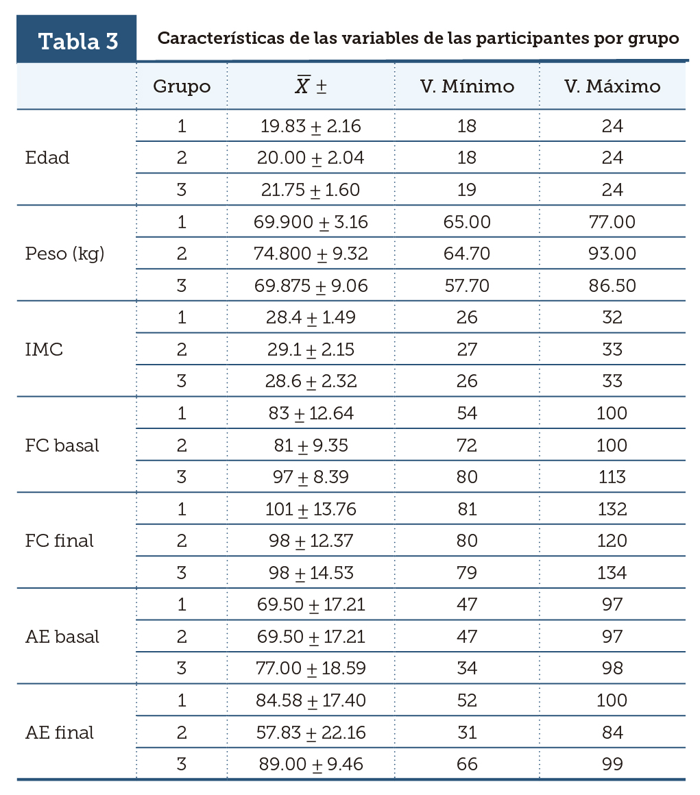| Tabla 3 | Características de las variables de las participantes por grupo |