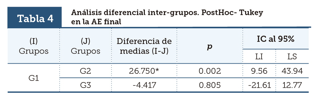 Para identificar el o los grupos que realizaron la diferencia, fue realizado un análisis diferencial intergrupos a través del PostHoc- Tukey, en donde se observa que existe una diferencia significativa entre el G1 y el G2 de acuerdo a los resultados de AE final, el G3 (control), cumple su función, no difiere del G1 (tabla 4).