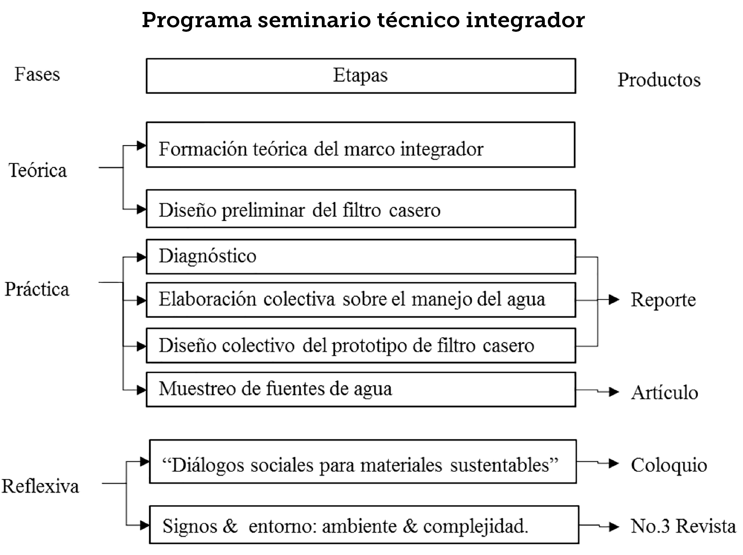 Tres fases se contemplaron para el diseño del programa: la formación teórica que versó con elementos introductorios de investigación y principios transdisciplinarios, la ejecución práctica con aplicación de los contenidos curriculares y la recapitulación reflexiva. Estas se articularon en una práctica integradora que tuvo por objetivo el diseño colectivo de un prototipo de filtro casero para el tratamiento de aguas grises a través la estrategia de Investigación Acción Participativa con componente educativo. Se presenta su organización en la figura 1. De esta manera se dio lugar al estudio de caso que ahora se describe.