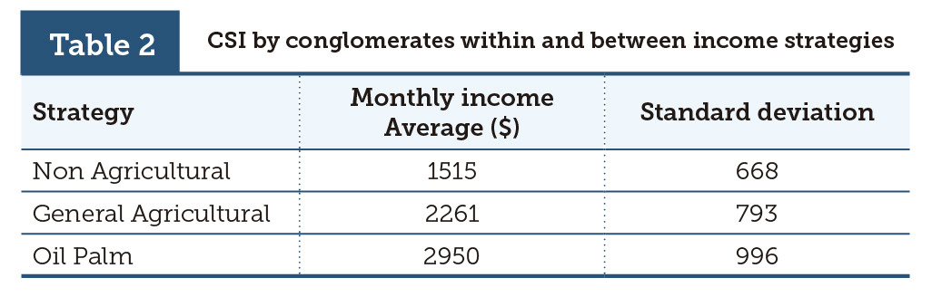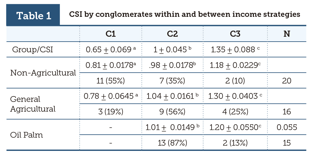 The income strategies identified as Non-agricultural, General Agricultural and Oil palm were classified according to the CSI conglomerates (table 1). Within this classification, a significant difference was observed among the strategies. Fifty-five percent of the DGs that practice the Non-agricultural strategy was food insecure, while 35% belonged to conglomerate 2% and 10% to conglomerate 3. This indicates that farmers’ families are better off than the families that do not have access to the land, reflecting the lower incomes of the families that depend on wage labor and other activities. Meanwhile, 19% of DGs that practice the General Agricultural strategy was found to be food insecure, while 56% fell into conglomerate 2 and 25% within conglomerate 3. Those DGs practicing the Oil Palm strategy were homogenous; 100% of these DGs had a high level of caloric sufficiency.