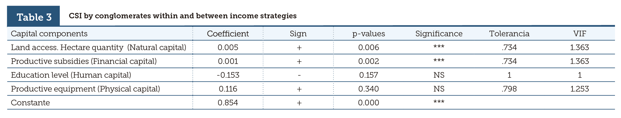 To identify the key elements influencing these outcomes, we carried out lineal regressions to see if CSI relates with various capital components among all DGs and their income strategy. The factors that influenced food security of the DGs significantly were land access and production subsidies. Education level and agricultural equipment did not show a significant relation with CSI. Caloric sufficiency measured according to CSI clearly varied with all livelihood strategy (table 3). The indicated regression model did not show multicollinearity, as shown by the factors of tolerance and variance inflation (VIF). The model also did not show autocorrelation, as demonstrated by the Durbin-Watson statistic (table 3).