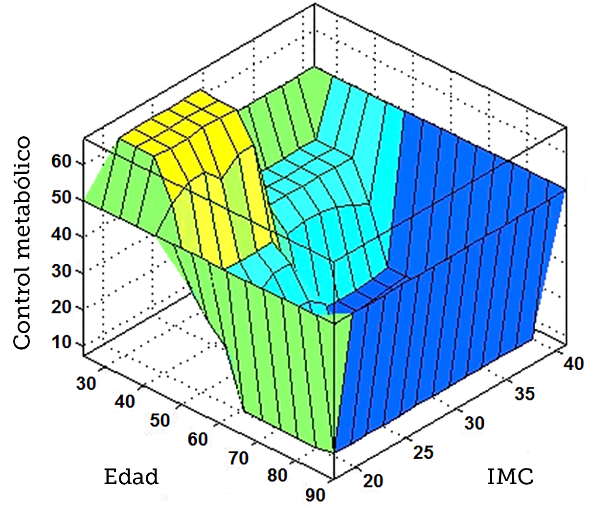 En la superficie de respuesta de la figura 1 se observa que un buen control metabólico está influido por los parámetros de los factores de riesgo (dos variables de entrada). Si estos parámetros activan una zona óptima (colores claros) se interpreta como un buen control, en cambio si los parámetros activan una zona no optima (colores oscuros) se presenta un descontrol metabólico en los pacientes con DM2.
