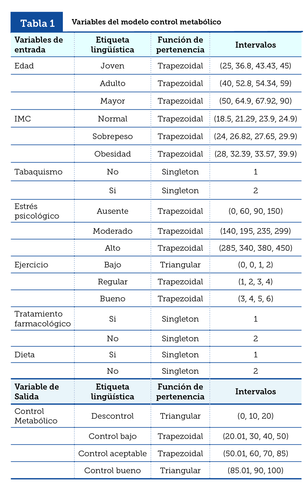 La arquitectura de las variables se estableció de dos formas. En la primera, se utilizaron Intervalos de Confianza (IC) (Meza et al., 2017) para la media al determinar los rangos que van a ser usados por los conjuntos difusos en las variables Edad e IMC; y en la segunda, la arquitectura se basa en el uso de los parámetros extraídos de guías de práctica clínica (GPC) (IMSS, 2009), fundamentos en el cuidado del paciente diabético (ADA, 2015) y la experiencia de un equipo de médicos especialistas.