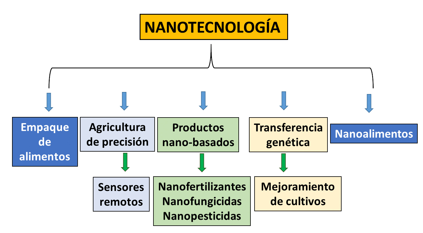 La aplicación de la NT en la agricultura y la industria de alimentos también están recibiendo mucha atención en la actualidad. Las inversiones en agricultura y alimentación nanotecnológica van en aumento debido a sus beneficios potenciales, los cuales incluyen desde la mejora en la calidad e inocuidad de los insumos agrícolas hasta un mejor procesamiento y mayor valor nutricional de los mismos (Dasgupta et al., 2015). Mientras que la mayor inversión en NT se realiza en los países desarrollados, los avances de investigación ofrecen una visión de potenciales aplicaciones en la agricultura y la alimentación de todo el mundo y, en especial, para zonas marginadas, que podría tener un impacto significativo en las poblaciones rurales de los países en desarrollo (Prasad et al., 2014).