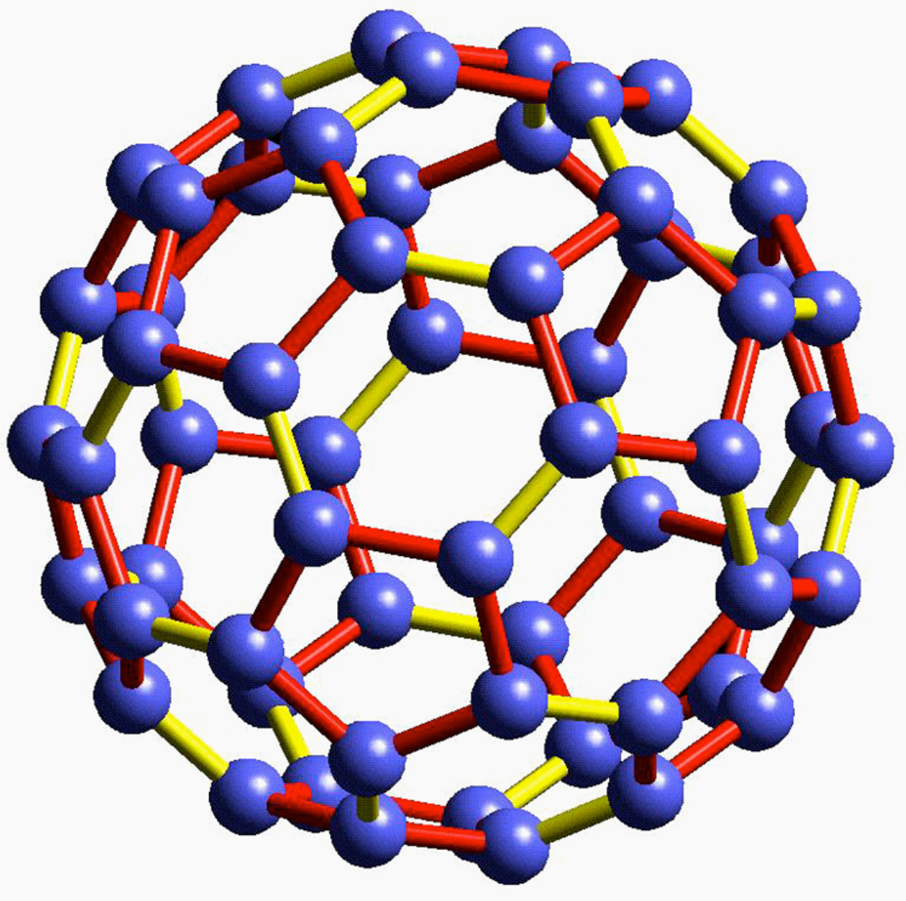 Representación esquemática de la nanopartícula llamada fullereno o bola de Buckminster conteniendo 60 carbonos. Los fullerenos son moléculas tridimensionales estables y muy resistentes, las cuales están constituidas exclusivamente por un número definido de átomos de carbono, donde las más comunes son el C60 y C70.