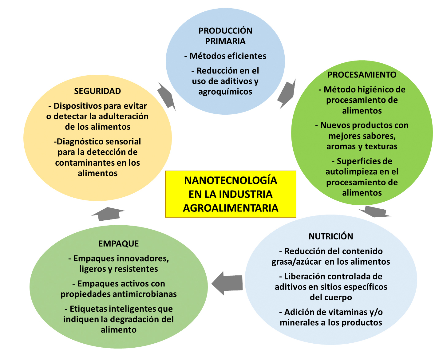 Las NPs ya sean metálicas derivadas del carbón u otros materiales como arcillas, etc., pueden emplearse en muchos aspectos como la agricultura y el procesamiento higiénico de alimentos para generar incrementos en la eficiencia de los agroinsumos y para reducir significativamente las cantidades de productos por aplicar, así como para la elaboración de productos alimenticios con mejores sabores, aromas y texturas (Singh et al., 2015).