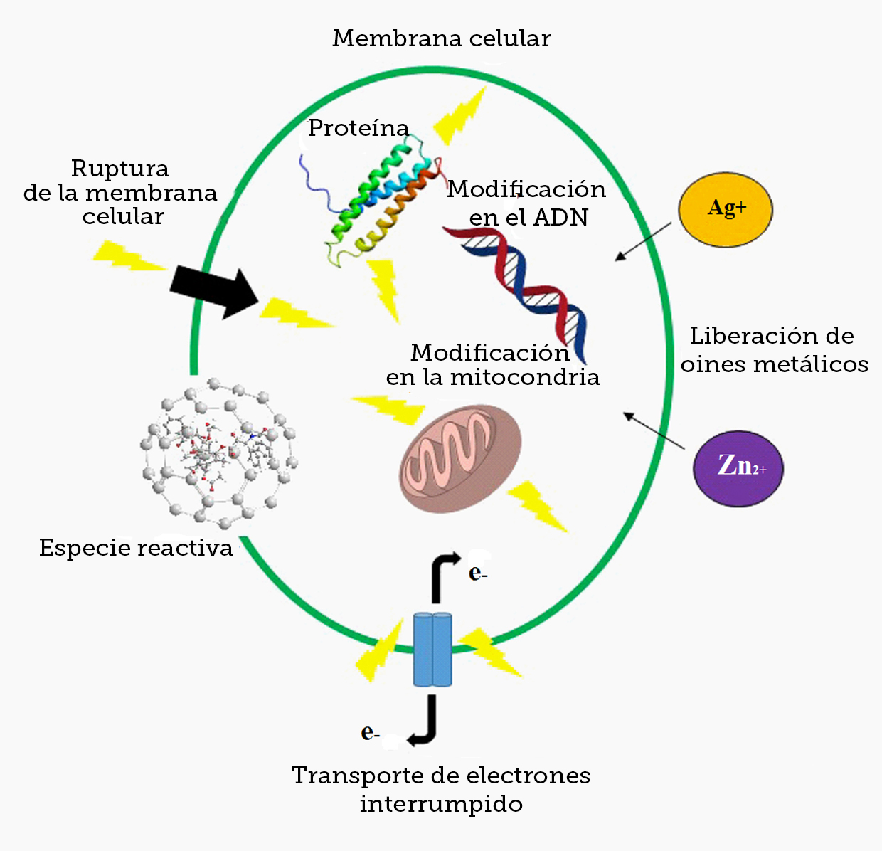 Esquema que ilustra el efecto antibacterial de las nanopartículas de plata en las membranas, mitocondrias, organelos celulares, el ADN nuclear, así como en la producción de especies reactivas de oxígeno (ROS, por sus siglas en inglés), que se generan como respuesta a las nanopartículas cuando penetran al interior de las células. El mecanismo antibacteriano de las NPs puede ser debido a un aumento en la generación de ROS intracelular, lo que provoca estrés oxidativo a las células bacterianas. También se pueden adherir a la membrana celular, con lo que alteran su permeabilidad y funciones respiratorias, asimismo, interactúan con la superficie de las membranas y penetran en el interior celular, causando daño a los diferentes organelos y a nivel del ADN en el núcleo.