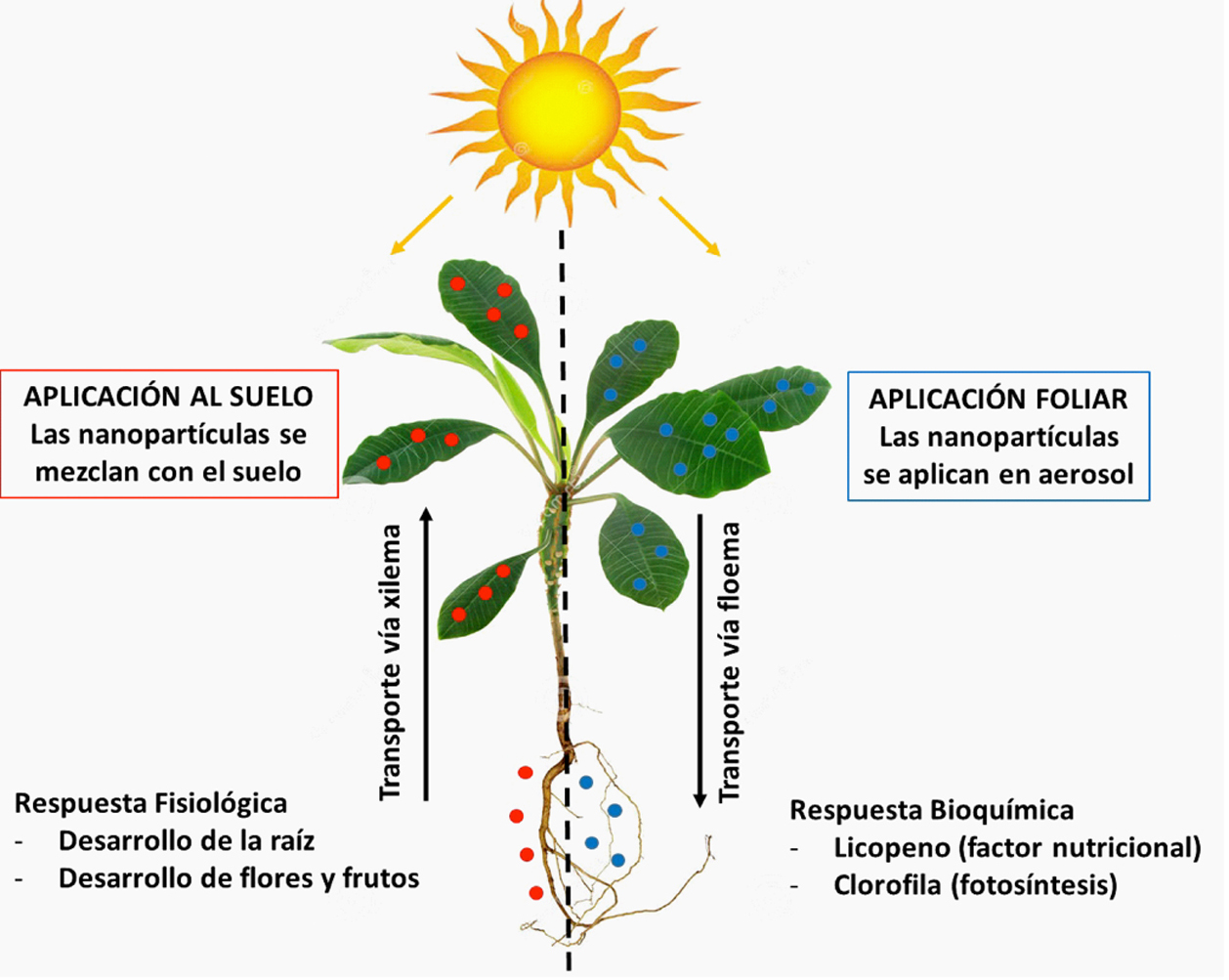 Las nanopartículas pueden aplicarse foliarmente mediante aspersión y en el agua de riego a la zona de las raíces, pudiendo luego transportase a diversos sitios de las plantas por las rutas del xilema y el floema, donde inducirán múltiples respuestas fisiológicas y bioquímicas. Las NPs inician su recorrido mediante el proceso de absorción y translocación en la raíz por la ruta del simplasto y apoplasto, en seguida llegan a la corteza y atraviesan la endodermis por el tejido conductivo del xilema; luego continúan su movimiento ascendente en el xilema; cuando las NPs se aplican al follaje el transporte hacia las raíces siguen la vía del floema.