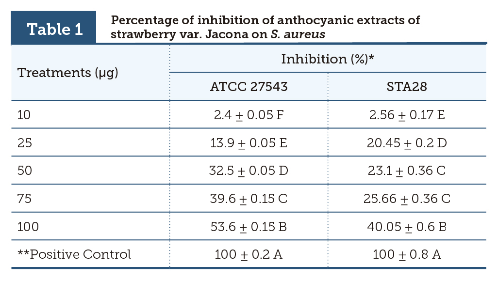 Anthocyanic extracts of F. x ananassa var. Jacona showed significant antibacterial activity (p ≤ 0.05) on the growth of S. aureus ATCC 27543, since all the assayed amounts inhibited its growth. Inhibition percentages observed oscillated between 2.4% and 53.6%, which increased in proportion to the applied amount (table 1). Similarly, the assays with the isolated STA28 revealed a significant antimicrobial activity (p ≤ 0.05) in all the amounts of anthocyanic extract assayed. Inhibition percentages observed were from 2.56% to 40.05% (table 1).