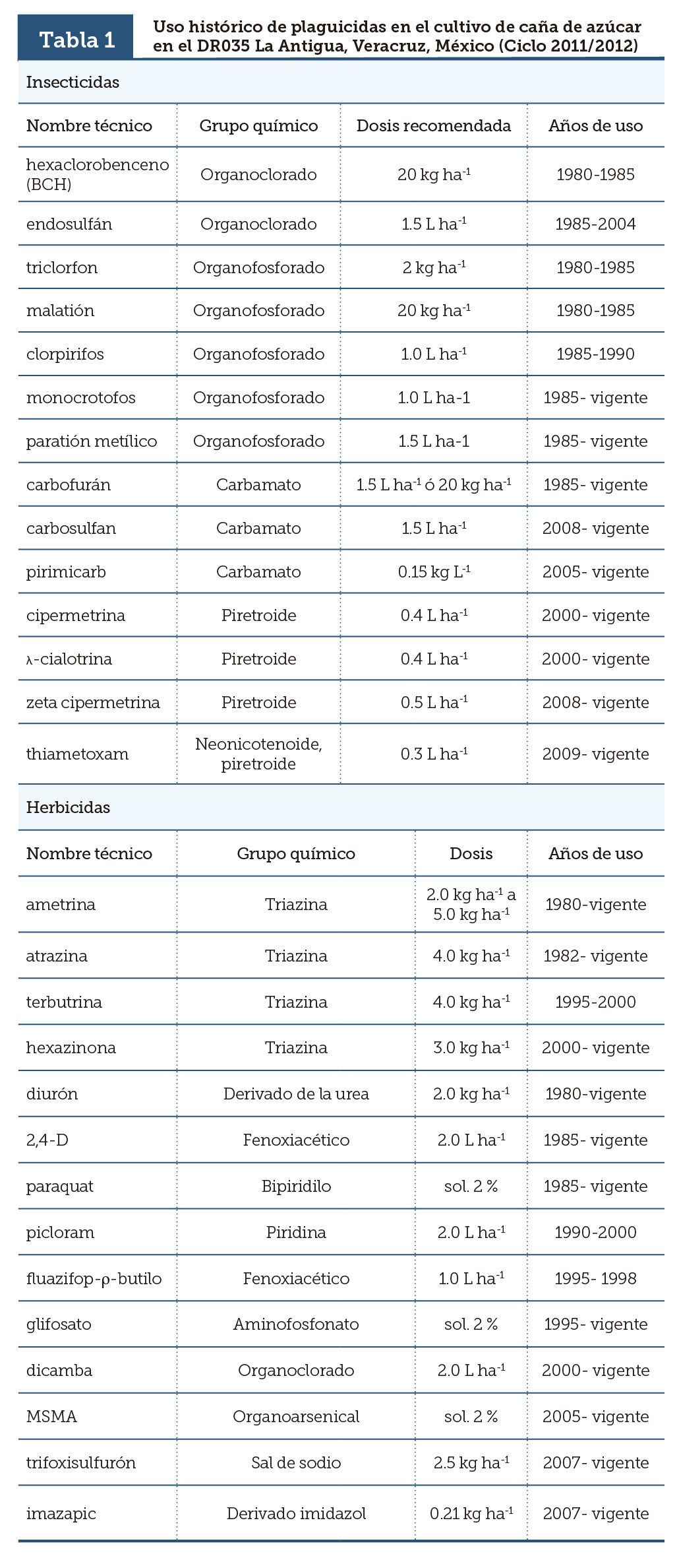 | Tabla 1 | Uso histórico de plaguicidas en el cultivo de caña de azúcar en el DR035 La Antigua, Veracruz, México (Ciclo 2011/2012) |