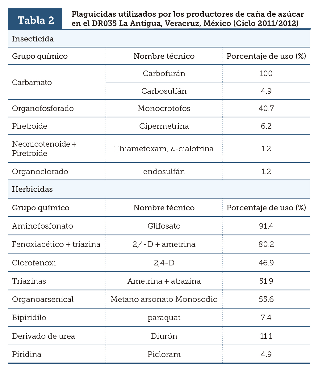 Los plaguicidas utilizados en el cultivo de caña de azúcar en la región de estudio han variado ligeramente en los últimos 30 años, salvo en su formulación, lo que implica que no se ha buscado sustituir los productos con mayor nivel de toxicidad. El principal insecticida utilizado es carbofurán y en cuanto a herbicidas, glifosato y 2,4-D. Se ha dejado de lado el uso de organoclorados, aunque se documentó el uso de endosulfán durante la fase de campo. Los productos utilizados por los agricultores son aquellos recomendados desde que establecieron el cultivo y no manifestaron interés alguno por cambiar o modificar el tipo de producto que están aplicando, salvo cuando no logran el control de la plaga deseada o cuando presentan alguna reacción alérgica o tóxica durante el manejo del producto.
