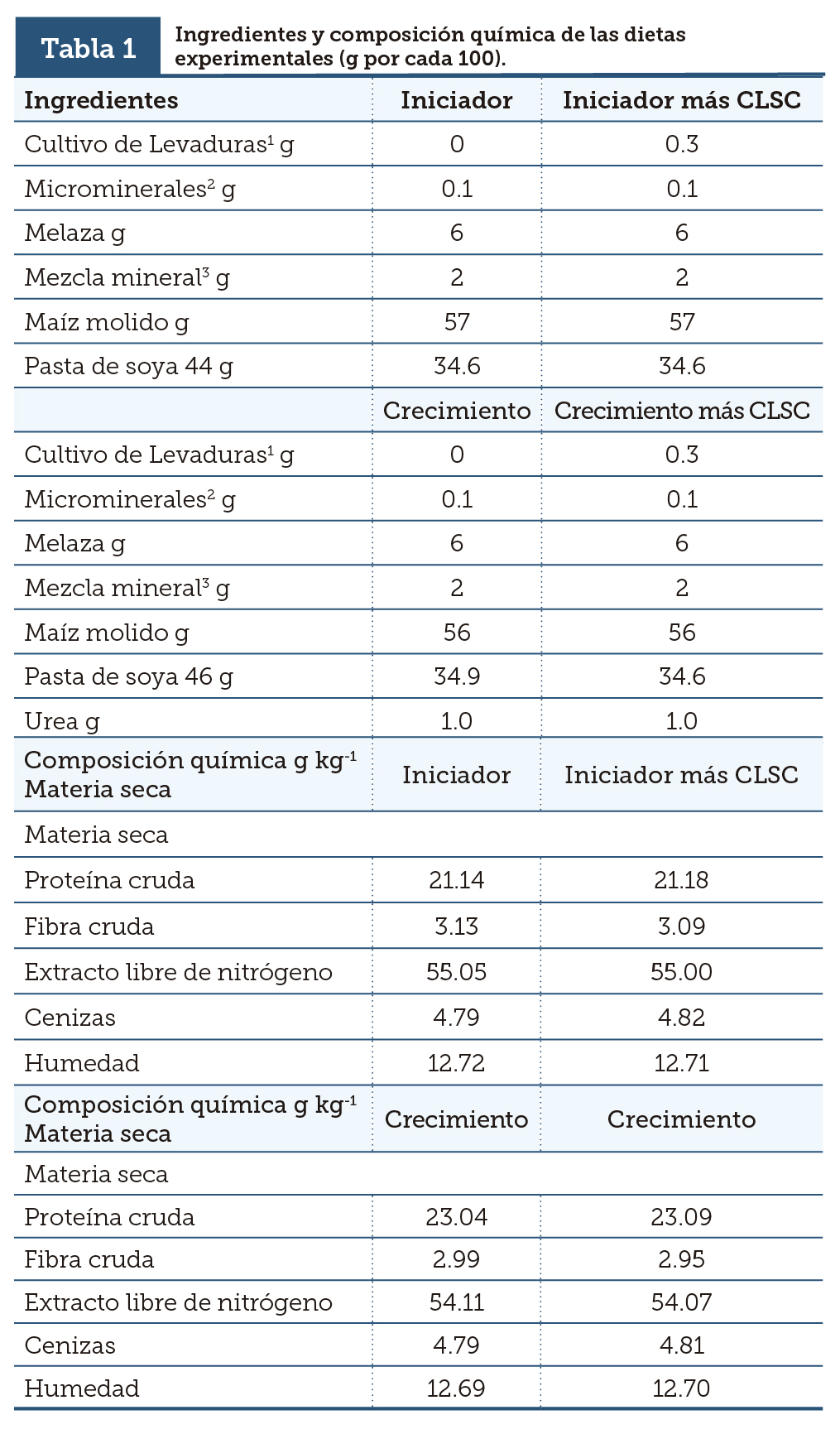 Se evaluaron T1 = alimento iniciador y T2 = alimento iniciador más 0.3% de CLSC; posteriormente a partir del día 135 el alimento iniciador se cambió por alimento de crecimiento (tabla 1). Se utilizaron 16 becerros (8 animales por tratamiento) del Genotipo racial Cebú x Suizo Europeo con edades entre los cinco y 27 días de nacidos.