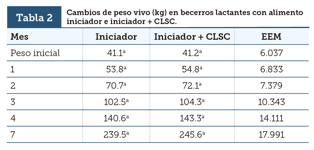 | Tabla 2 | Cambios de peso vivo (kg) en becerros lactantes con alimento iniciador e iniciador + CLSC. |