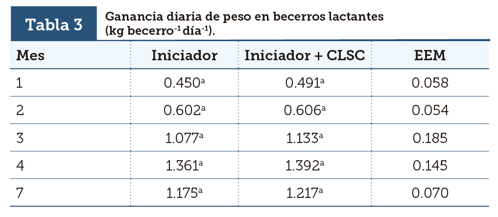 En la respuesta a los CPV en becerros lactantes no hubo diferencia (p > 0.05) entre tratamientos durante los siete meses que duró la fase experimental (tabla 2). Los becerros aumentaron peso vivo (PV) en relación con la edad y el consumo de iniciador, el mayor aumento de PV se tuvo entre los meses tres y cuatro, que fue de 41.9 kg para T1 y 41.0 kg para T2. El PV a los cuatro meses de edad, tiempo en que se realizó el destete, fue de 140.6 kg y 143.3 kg; mientras que a los siete meses de edad fue de 239.5 kg y 245.6 kg para los tratamientos sin y con CLSC de manera respectiva.