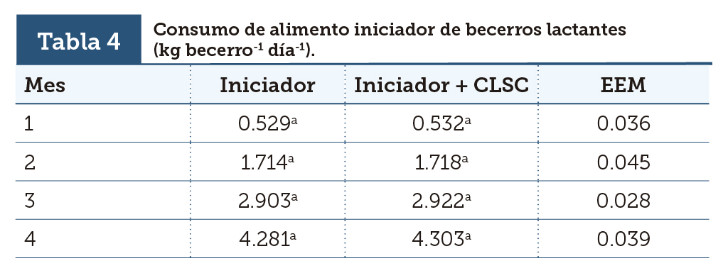 Los resultados de este estudio son superiores a lo reportado por Lesmeister et al. (2004), quienes evaluaron el consumo de iniciador en becerros lactantes que fue de 0.455 kg d-1 para el primer mes y 4.211 kg d-1 en el cuarto mes. Cuando el amamantamiento de los becerros durante la lactancia es restringido, como fue en este trabajo de investigación, el consumo de iniciador puede aumentar cuando se asigna a libre acceso; al respecto Plaza, Ruiz & Elías (1985) mencionan que la restricción del alimento lácteo va acompañada de un incremento en el consumo de alimento seco.