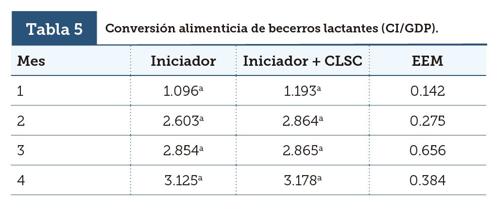 | Tabla 5 | Conversión alimenticia de becerros lactantes (CI/GDP). |