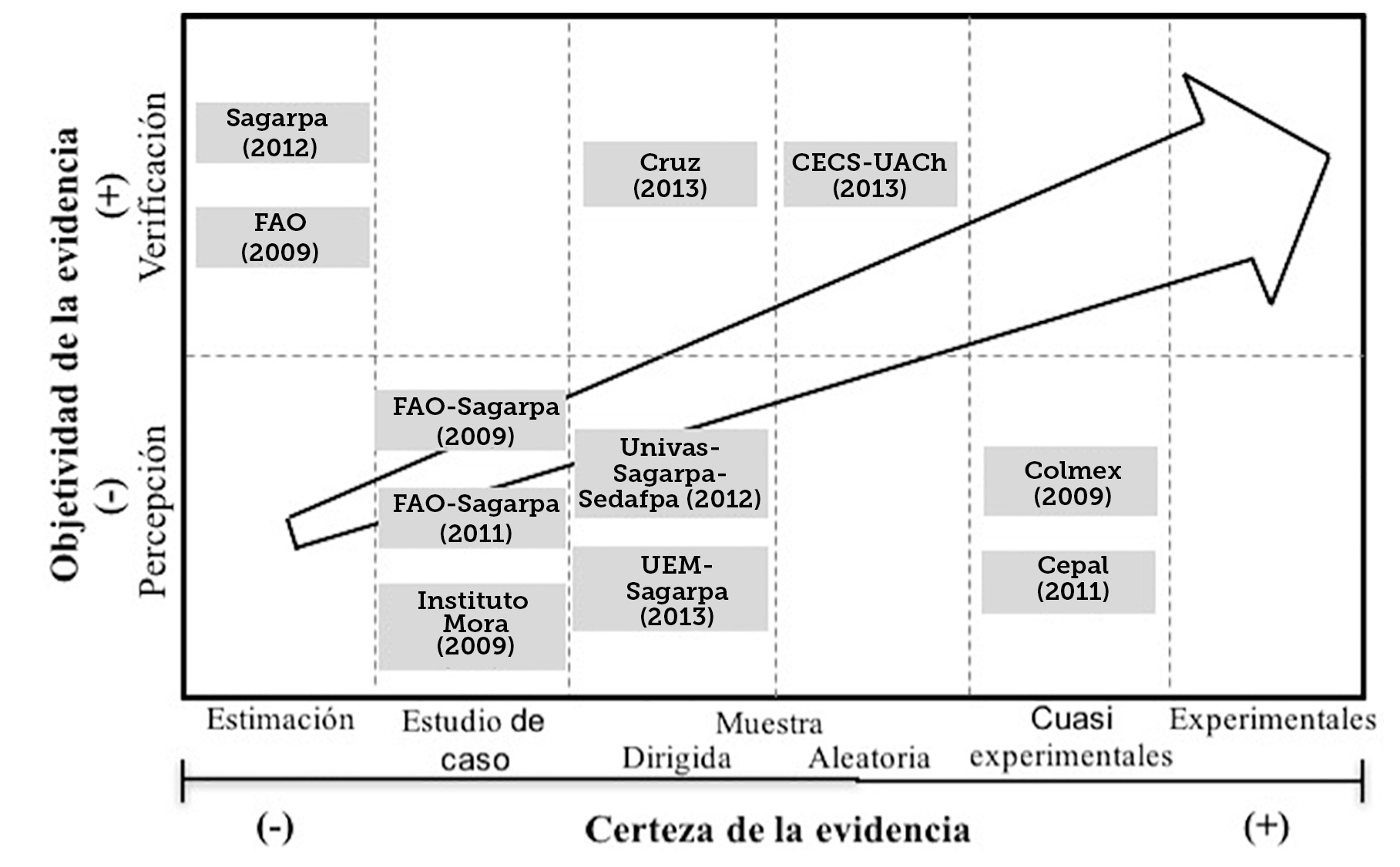 Los métodos de evaluación aplicados en Guerrero presentan un estándar consideradamente alto en certeza debido a que cuentan con un contrafactual que permite diferenciar los cambios entre los beneficiarios y no beneficiarios del programa, pero se les resta valor en objetividad en virtud de que los impactos son valorados mediante encuestas basadas en la percepción de los beneficiarios. En contraste, los estudios CECS-UACh (2013) y Cruz et al. (2016) son clasificados con mayor fuerza en la dimensión de objetividad por haberse realizado mediante el cálculo de muestras estadísticas de la población beneficiada y porque los resultados e impactos fueron estimados mediante la verificación en campo, tanto de la existencia de los proyectos, como de los niveles de producción alcanzados, sin embargo, tienen menor certeza por no contar con un contrafactual.