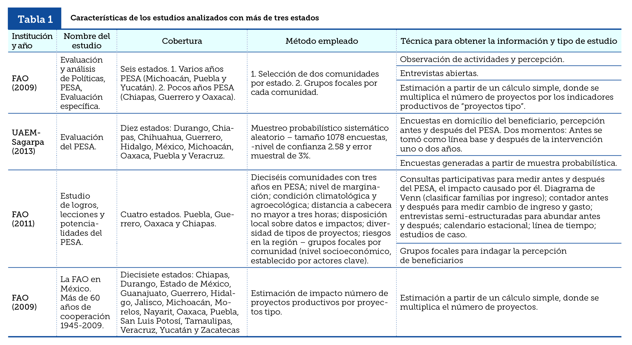 En las tablas 1 y 2 se describen las principales características de los estudios analizados enfatizando el método empleado y las técnicas para obtener la información. Se desglosan los estudios cuya cobertura incluye más de tres estados de la República Mexicana considerados como representativos de la cobertura total del programa y aquéllos que solo incluyen un estado.