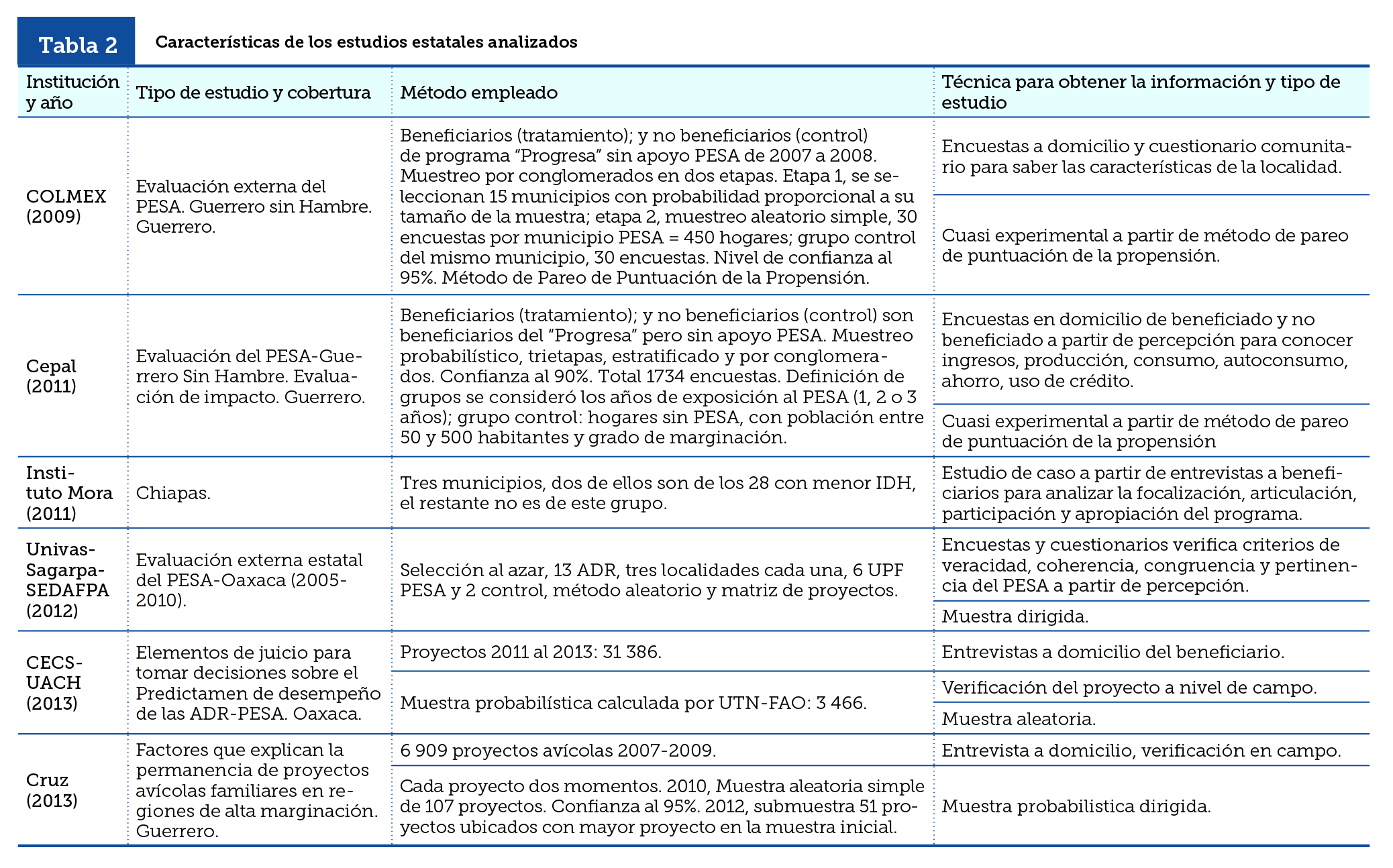 Estudio de logros, lecciones y potencialidades del PESA. | Cuatro estados. Puebla, Guerrero, Oaxaca y Chiapas. | Dieciséis comunidades con tres años en PESA; nivel de marginación; condición climatológica y agroecológica; distancia a cabecera no mayor a tres horas; disposición local sobre datos e impactos; diversidad de tipos de proyectos; riesgos en la región – grupos focales por comunidad (nivel socioeconómico, establecido por actores clave). | Consultas participativas para medir antes y después del PESA, el impacto causado por él. Diagrama de Venn (clasificar familias por ingreso); contador antes y después para medir cambio de ingreso y gasto; entrevistas semi-estructuradas para abundar antes y después; calendario estacional; línea de tiempo; estudios de caso. |