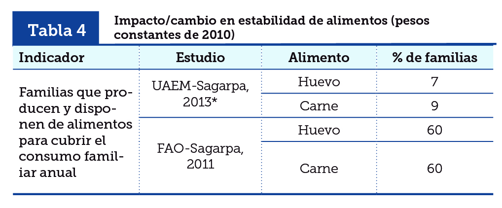 Continuando con las diferencias entre los diversos estudios para un mismo indicador (tabla 4), se observa que los datos de la proporción de familias que producen y disponen de alimentos para cubrir el consumo familiar anual en productos como el huevo y la carne de ave son muy contrastantes. Por ejemplo, mientras que el estudio de la UAEM et al. (2013) reporta un valor de 7% para el caso del huevo, el estudio de FAO y Sagarpa calcula un valor de 60%. Igual ocurre en el caso de la carne de ave.
