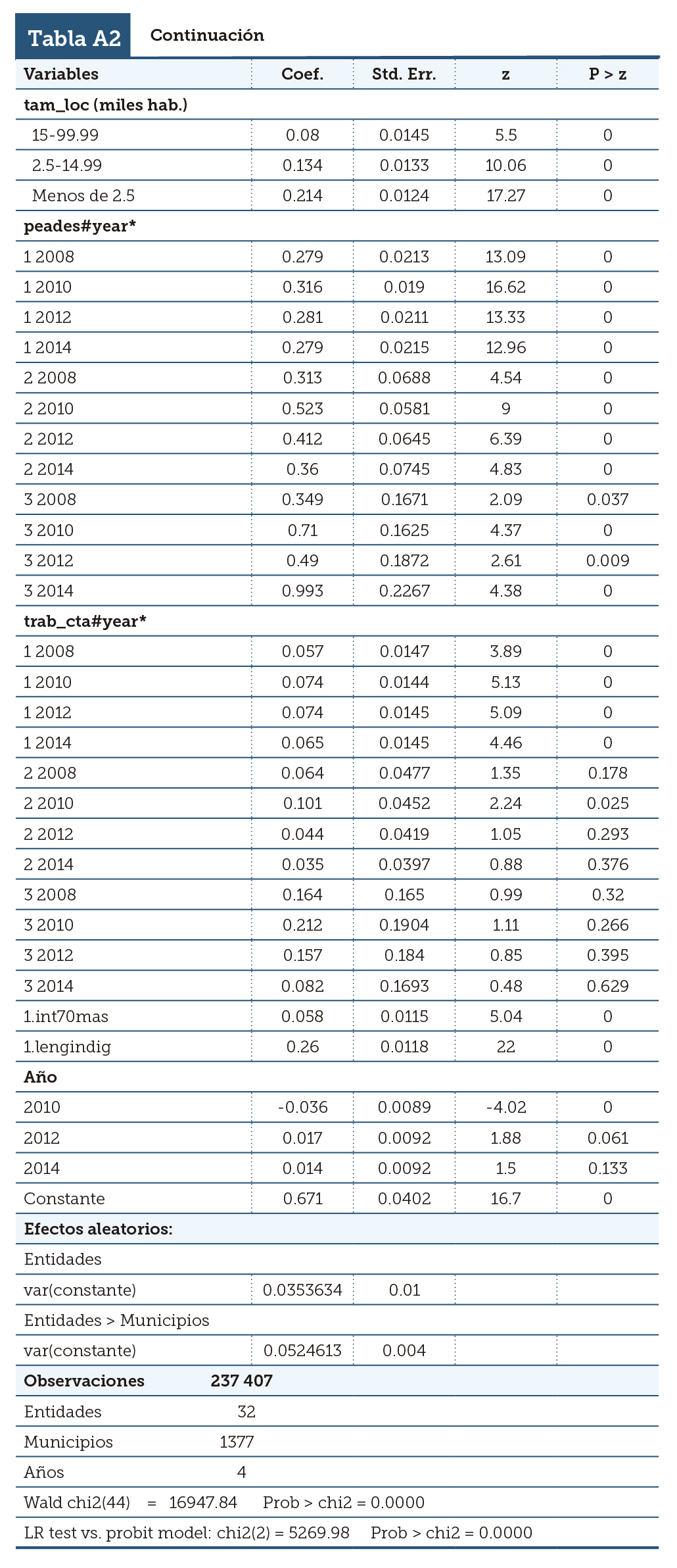 sexo_jefe, binaria que distingue si el jefe de hogar es hombre o es mujer; educa_jefe, indica mediante variables binarias once posibilidades de nivel educativo del jefe del hogar8. pea_des, variables binarias que indican cuatro posibilidades sobre el número de integrantes del hogar que forman parte de la PEA desocupada: cero, uno, dos y tres o más integrantes, respectivamente; trab_cta, similar a la variable anterior, consiste de cuatro binarias que indican tres posibilidades excluyentes en función del número de integrantes (cero, uno, dos o tres o más) cuya situación laboral es el autoempleo como única fuente de ingreso, en un negocio tan pequeño que él es el único trabajador; lingindig, binaria que indica si en el hogar se habla lengua indígena; int70mas, binaria que indica si en el hogar hay integrantes de 70 años o más; tam_loc, cuatro variables binarias que indican si el hogar se ubica en alguna localidad de los siguientes tamaños: 100 000 o más habitantes; 15 000 a 99 999 habitantes; 2500 a 14 999 habitantes y; menos de 2.5 mil habitantes. Además, se incluyeron cuatro variables binarias para capturar los efectos fijos de cada uno de los años muestrales.