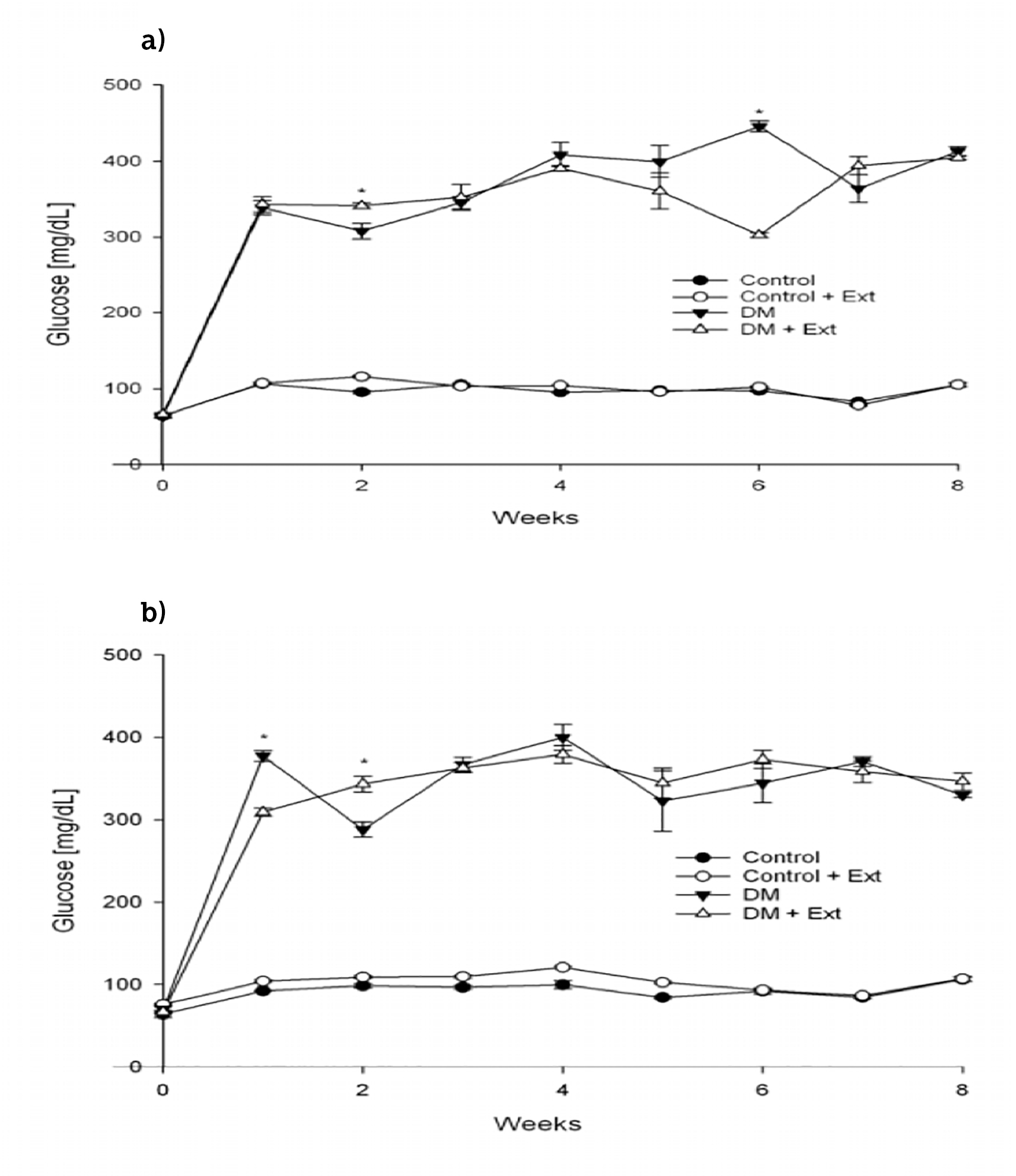 Effects of Turnera diffusa on blood glucose levels. a) T. diffusa var. diffusa and b) T. diffusa var. aphrodisiaca. Values were obtained weekly after Wistar male rats previously fasted for at least eight hours; they represent the mean ± SEM of n = 4-6 rats. *Significant differences were found between untreated versus treated rats (t test p ≤ 0.05).