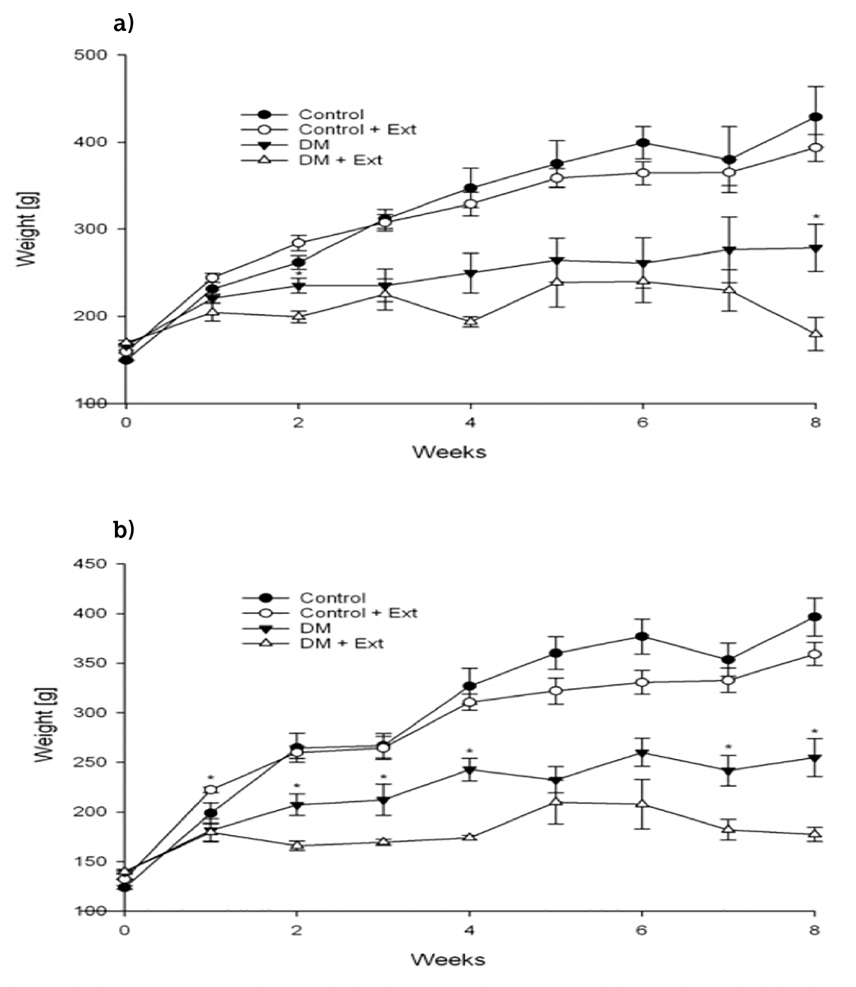 Effects of Turnera diffusa on body weight. a) T. diffusa var. diffusa and b) T. diffusa var. aphrodisiaca. Values were obtained weekly after Wistar male rats previously fasted for at least eight hours; they represent the mean ± SEM of n = 4-6 rats. *Significant differences were found between untreated versus treated rats (Student’s t-test p ≤ 0.05).