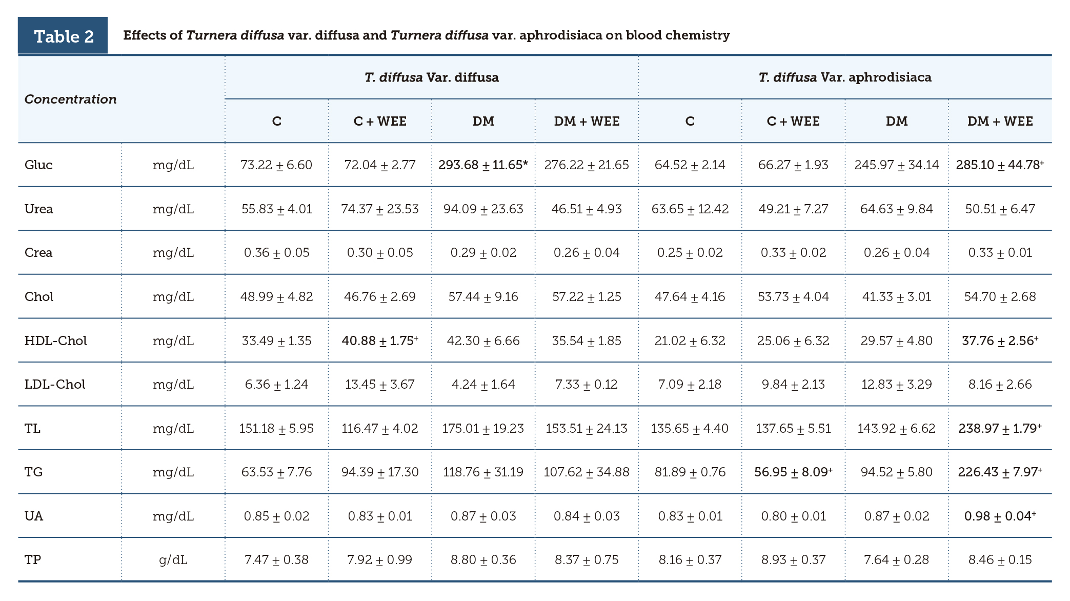 | Tabla 2 | Effects of Turnera diffusa var. diffusa and Turnera diffusa var. aphrodisiaca on blood chemistry |