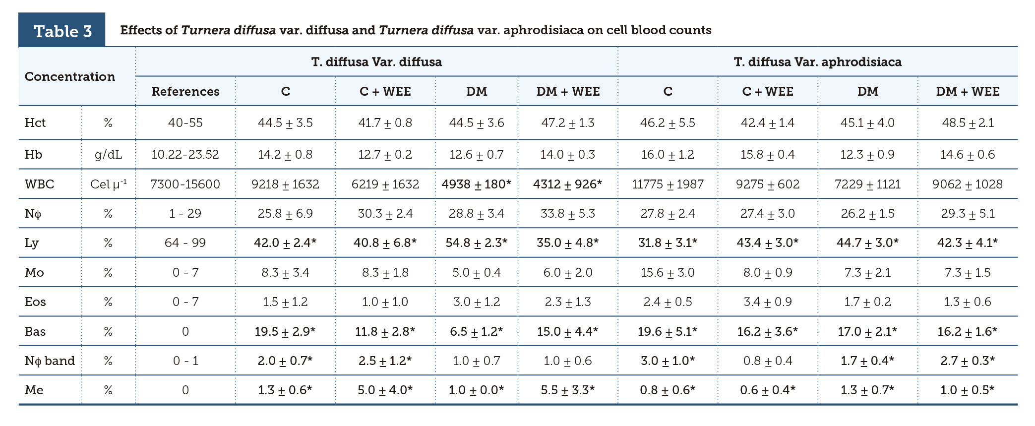 | Tabla 3 | Effects of Turnera diffusa var. diffusa and Turnera diffusa var. aphrodisiaca on cell blood counts |