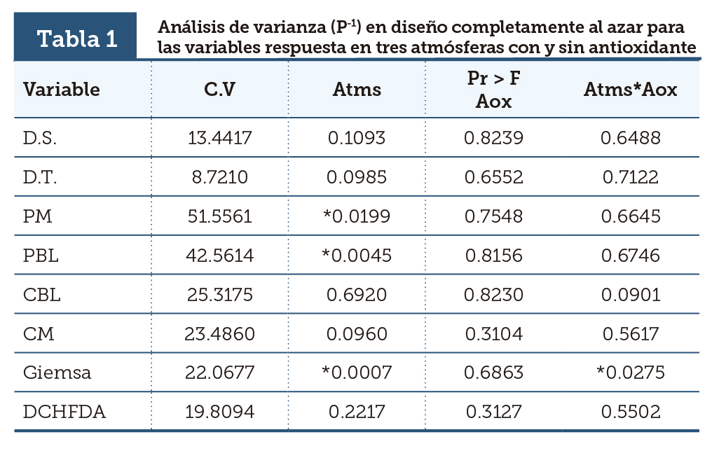 | Tabla 1 | Análisis de varianza (P-1) en diseño completamente al azar para las variables respuesta en tres atmósferas con y sin antioxidante |