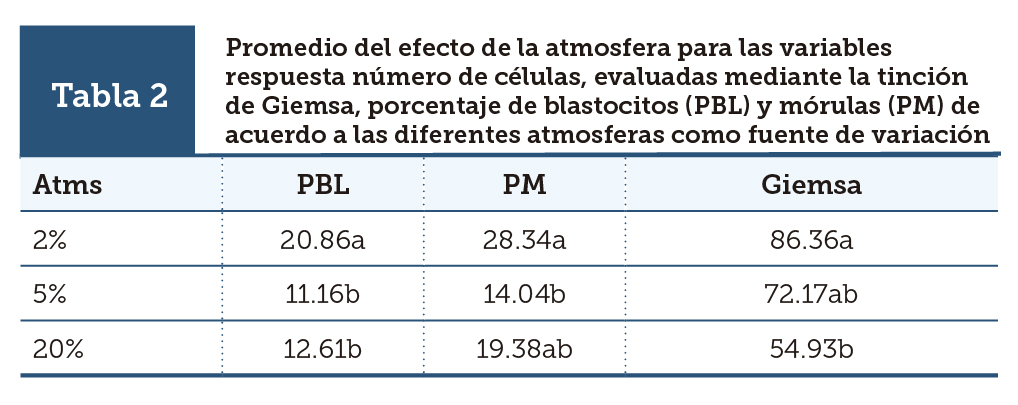 | Tabla 2 | Promedio del efecto de la atmosfera para las variables respuesta número de células, evaluadas mediante la tinción de Giemsa, porcentaje de blastocitos (PBL) y mórulas (PM) de acuerdo a las diferentes atmosferas como fuente de variación |