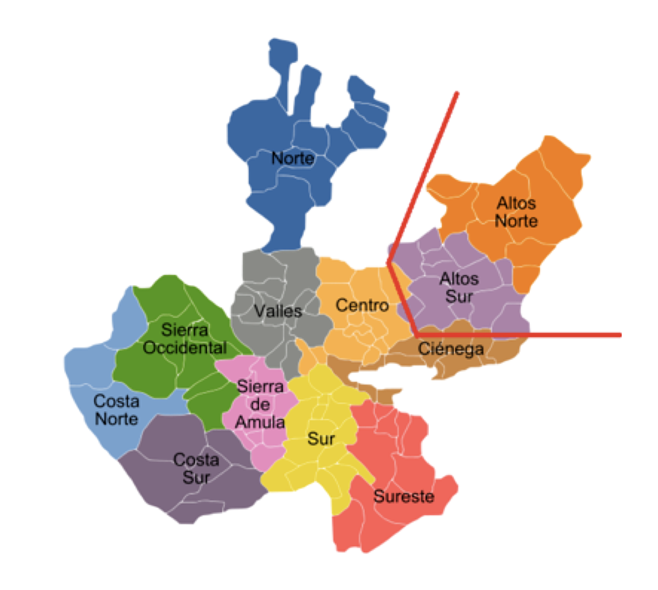 En el año de 1998 se instituyó la "Regionalización administrativa" del estado de Jalisco para promover el progreso de la entidad, congregándose los 125 municipios en 12 regiones (figura 1), cada una asumiendo a un municipio sede que hace la función de centro neurálgico de la región (Ramírez & Martínez, 2006).