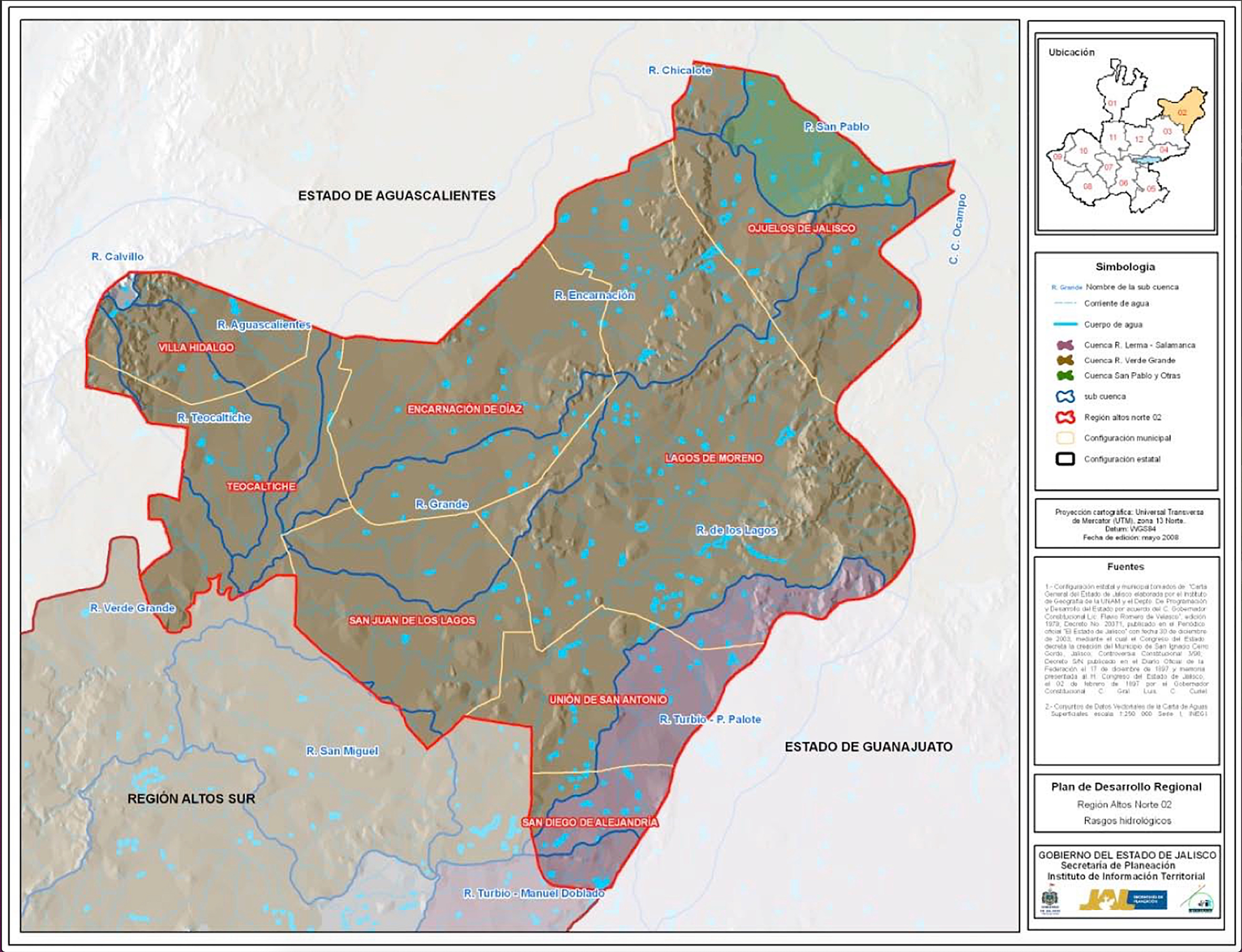 Esta región se enclava dentro de la región hidrológica Lerma-Santiago y el Rio el Salado con presencia en 3 cuencas hidrológicas: Río Verde Grande, Lerma-Salamanca y San Pablo, siendo la cuenca del Río Verde la dominante. El municipio sede es Lagos de Moreno, los municipios más poblados son; Lagos de Moreno, San Juan de los Lagos y Encarnación de Díaz, los cuales tienen en conjunto 270 432 habitantes lo que equivale al 70.55% de la población total de la región, siendo este el criterio de ciudad-región que se ve beneficiado al proponer tres nodos (Lagos de Moreno, San Juan de los Lagos y Encarnación de Días) con un perfil poblacional que permite un desarrollo más homogéneo entre los municipios.