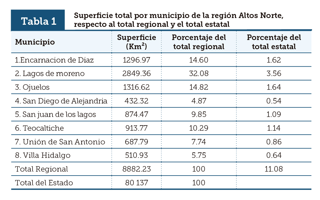 Por su parte, la región de Los Altos Norte se ubica en la parte norte del estado de Jalisco muy próximo al estado de San Luis Potosí, cuenta con una superficie territorial de 8882.23 km², que corresponde al 11% de la superficie estatal total. Limita al norte con los estados de Aguascalientes y Zacatecas, al este con Zacatecas y Guanajuato, al oeste con Zacatecas y al sur con la región Altos Sur de Jalisco. Los 8 municipios que conforman esta región y su extensión territorial aparecen en la tabla 1, asimismo su ubicación geográfica se puede apreciar en la figura 2.