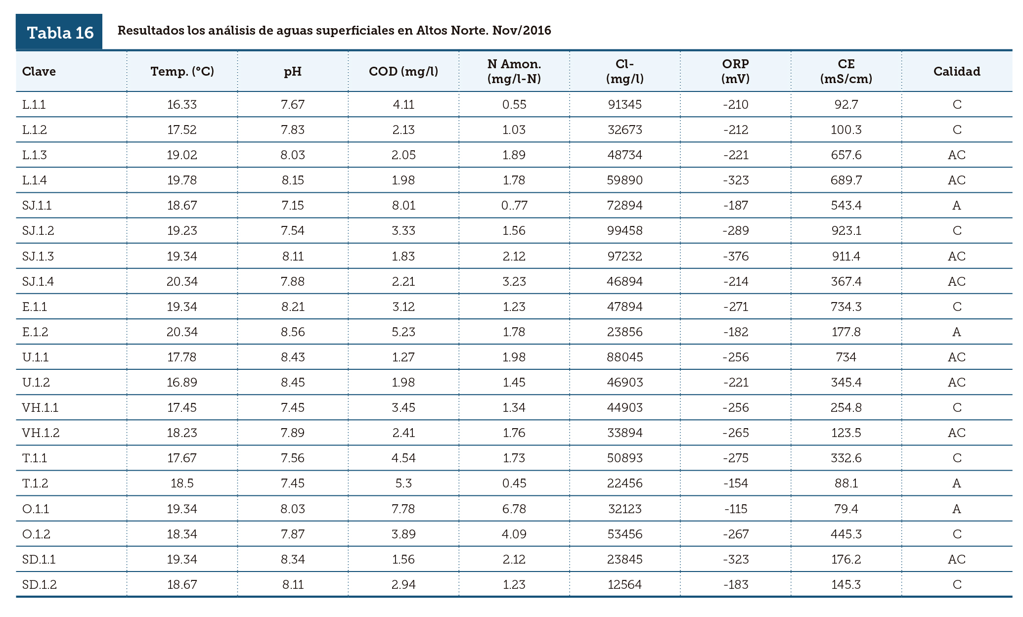 | Tabla 16 | Resultados los análisis de aguas superficiales en Altos Norte. Nov/2016 |