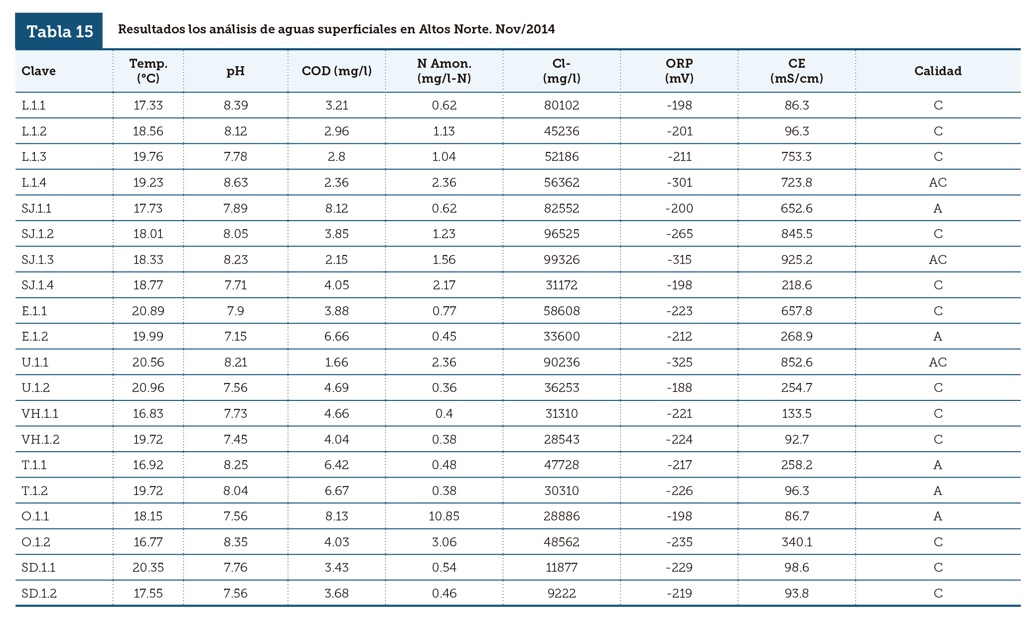 | Tabla 15 | Resultados los análisis de aguas superficiales en Altos Norte. Nov/2014 |